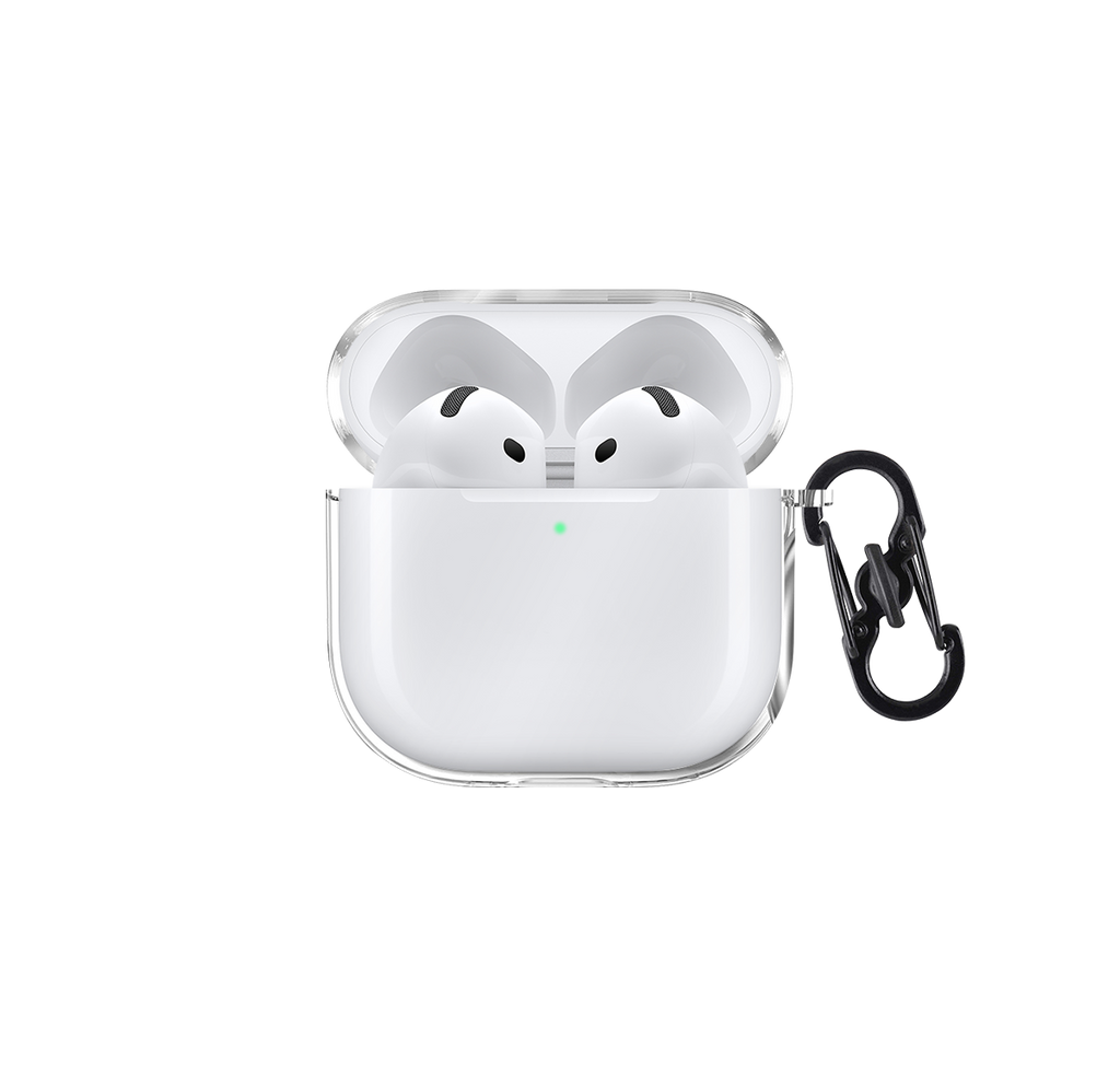 - Durable clear shell case with metal carabiner for AirPods 4